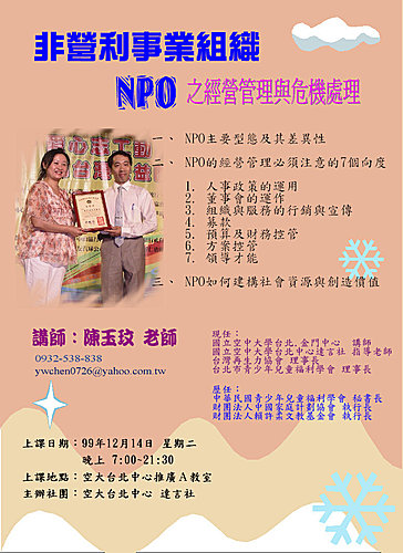 台灣再生力協會理事長陳玉玟,同時也是國立空大講師,並為空大台北中心達言社指導老師,擬於99年12月14日19:00~21:30於空大台北中心專題演講『非營利事業組織之經營管理與危機處理』,歡迎蒞臨指導。